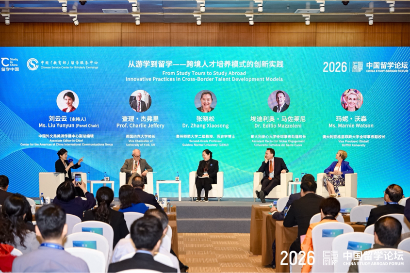 在“从游学到留学——跨境人才培养模式的创新实践”专题中,中国外文局美洲传播中心副总编辑刘云云主持,英国约克大学校长查理·杰弗里、贵州师范大学张晓松教授、意大利圣心大学全球事务助理校长埃迪里奥·马佐莱尼、澳大利亚格里菲斯大学全球事务副校长玛尼·沃森作为嘉宾参与讨论。嘉宾围绕学分互认、课程设计及实践教学等内容进行交流,表示游学项目通过践学融合的方式,帮助学生在短期内加深对中国文化与专业领域的理解,推动国际学生从游学转向长期留学。中英游学领航计划的实施通过学分互认机制推动了国际学生深度双向流动,展现了教育国际合作的“中国方案”。