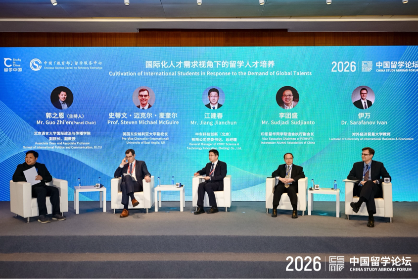 在“国际化人才需求视角下的留学人才培养”专题中,北京语言大学国际政治与传播学院副院长郭之恩主持,英国东安格利亚大学副校长史蒂文·迈克尔·麦奎尔、中车科技创新(北京)有限公司党委书记、总经理江建春先生、印尼留华同学联谊会执行副会长李团盛及对外经济贸易大学教师伊万参与讨论。嘉宾围绕用人需求与留学教育实践展开,表示在全球科技与产业革命、人工智能技术加速发展的背景下,国际化人才培养需要更加关注跨学科能力、跨文化沟通能力和产学研结合。