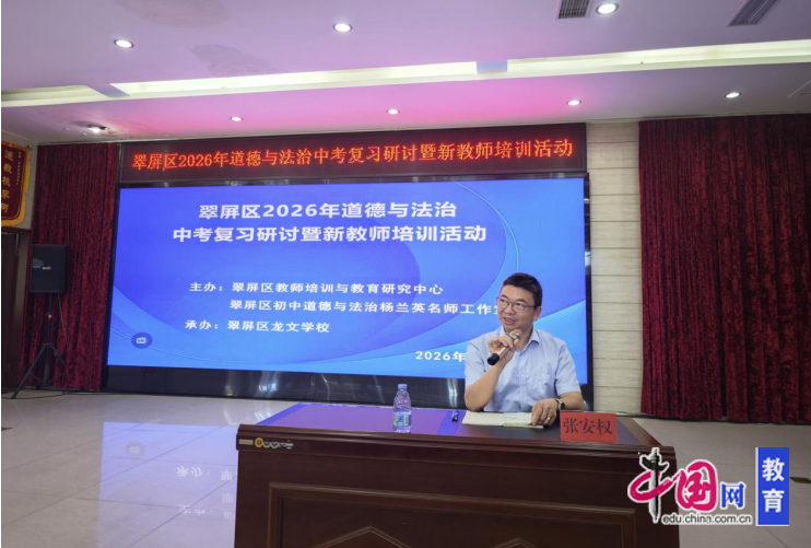 为精准把握中考命题趋势,探索科学高效的复习策略,4月10日,由宜宾市翠屏区教师培训与教育研究中心、翠屏区初中道德与法治杨兰英名师工作室主办,宜宾市龙文学校承办的“翠屏区2026初中道德与法治中考复习研讨暨新教师培训活动”圆满举行。
