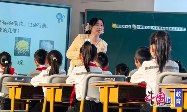 峨眉山市“李建玲”小学数学工作室团队的谢璐老师执教《求一个数是另一个数的几倍》。本节课重点聚焦“理解‘倍’的本质,掌握求一个数是另一个数的几倍的计算方法”,以峨眉二小特色项目“神农百草园”情境为切入点,通过“画一画、写一写、说一说”的分层活动,引导学生在菊花与芍药的数量对比中,用图形表征“份数关系”,自主推导计算逻辑。谢璐老师以“问题—表征—算式—结论”为脉络,清晰呈现核心信息,搭配直观图形与规范列式,将抽象的倍数关系转化为可感知的“包含除”模型,既梳理了知识脉络,又搭建了思维脚手架,帮助学生突破认知难点。同时,谢璐老师依托学习单设计梯度练习,层层递进,引导学生从直观操作走向抽象建模,在互动探究中深化对“倍”的理解。