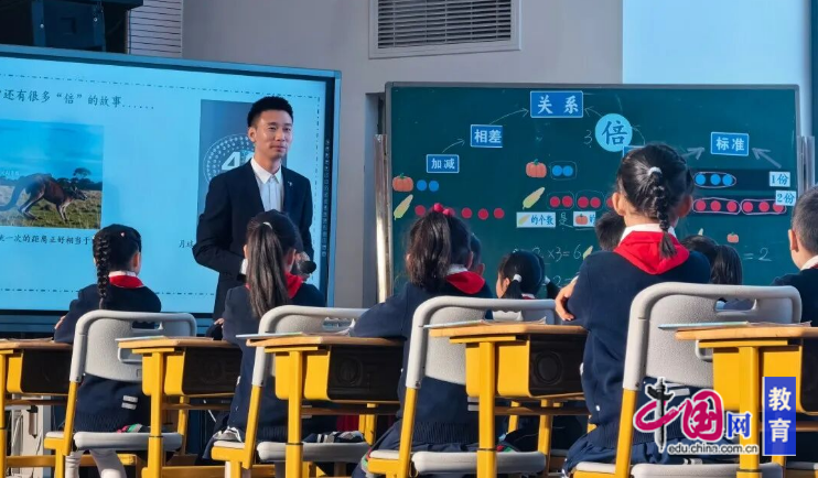 乐山市中区曾强小学数学名师团队领衔人曾强老师展示了精彩课例《倍的认识》。曾强老师以“比一比,找关系”为切入点,引导学生在南瓜与玉米的数量对比中,感知“几份”与“几倍”的对应关系。曾强老师以学生为主体,通过分层任务、互动探究,引导学生从直观操作走向抽象思考,逐步建立“倍”的数学模型,培养学生的数感与逻辑思维能力。从具象操作到抽象建模,从板书巧设到难点突破,曾老师用一堂课解锁概念教学新范式,为“倍的认识”这类概念课提供了可复制、可推广的教学范式。