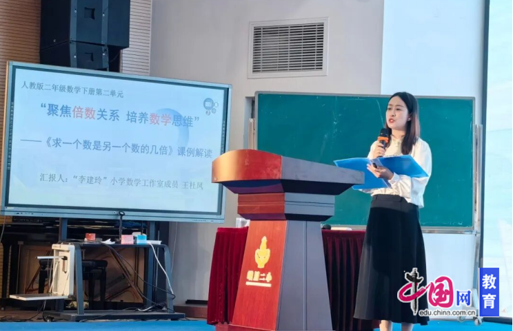 峨眉山市“李建玲”小学数学工作室成员王杜凤老师带来主题为“聚焦倍数关系,培养数学思维”的专题讲座,对人教版二年级下册《求一个数是另一个数的几倍》进行课例深度解读。讲座围绕单元教学目标,从倍数关系的本质出发,拆解课例设计逻辑,分享如何通过具象操作、情境创设,引导学生理解“倍”的概念,搭建从直观到抽象的思维桥梁,为一线教师提供了可落地的教学思路。