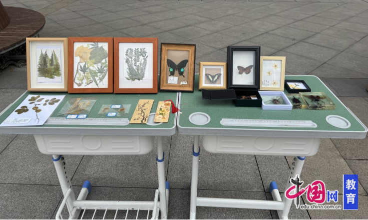 生命虽短暂,但美丽可以永恒。展翅欲飞的蝴蝶、脉络清晰的植物叶片、精巧完整的甲虫、姿态挺拔的蕨类卷轴依次陈列。学生在制作中化身“小小博物学家”,以细致处理与耐心制作,让逝去的生命以另一种形式延续自然的传奇。
