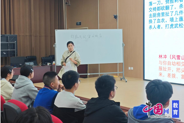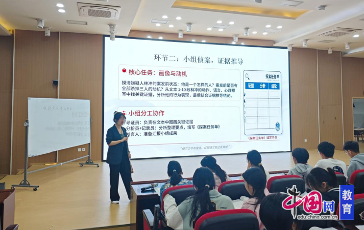李庄中学罗雨婷老师以“侦探办案”为创新情境,将课堂设计为“案件侦破”流程,通过“紧急案情通报”导入,以“画像与动机”为核心任务,引导学生分组从线索组、推理组、法理组、环境组等维度,探究林冲“忍辱苟安”到“官逼民反”的转变,用沉浸式任务驱动学生深度解读人物与情节,课堂互动性强、探究氛围浓厚。