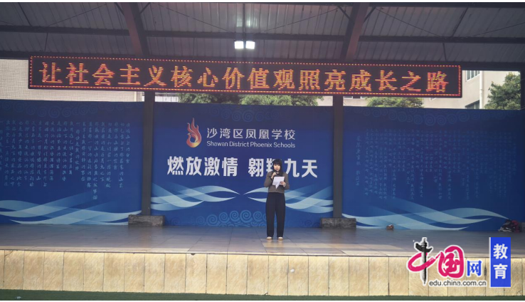 为厚植爱国主义情怀,引导学生树立正确的世界观、人生观、价值观,4月13日,乐山市沙湾区实验初级中学全体师生整齐列队于操场,在国旗下共同聆听教科室主任王燕琼以“让社会主义核心价值观照亮成长之路”为主题的深刻生动的思政教育课。