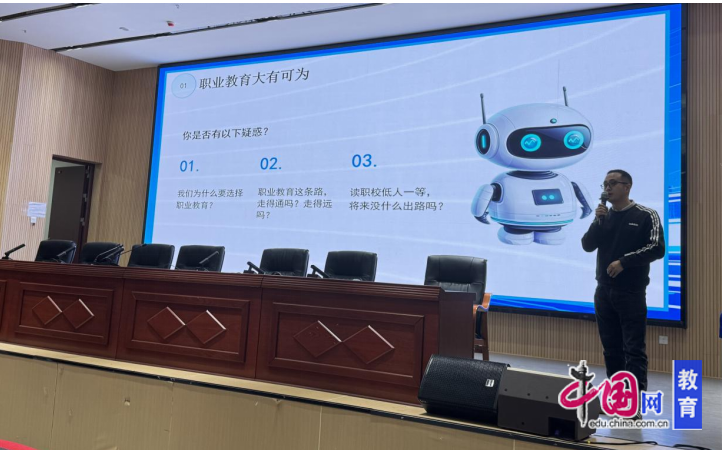 潘绍飞介绍了近些年的职业教育相关政策,强调人工智能、智能制造等领域技能人才需求旺盛的优势,给同学们的未来职业方向树立信心。他还介绍了乐山职业技术学院和人工智能学院的概况,对专业建设和前景做了细致分享,使同学们对专业有了更深入的了解,更加坚定了学好专业的决心。