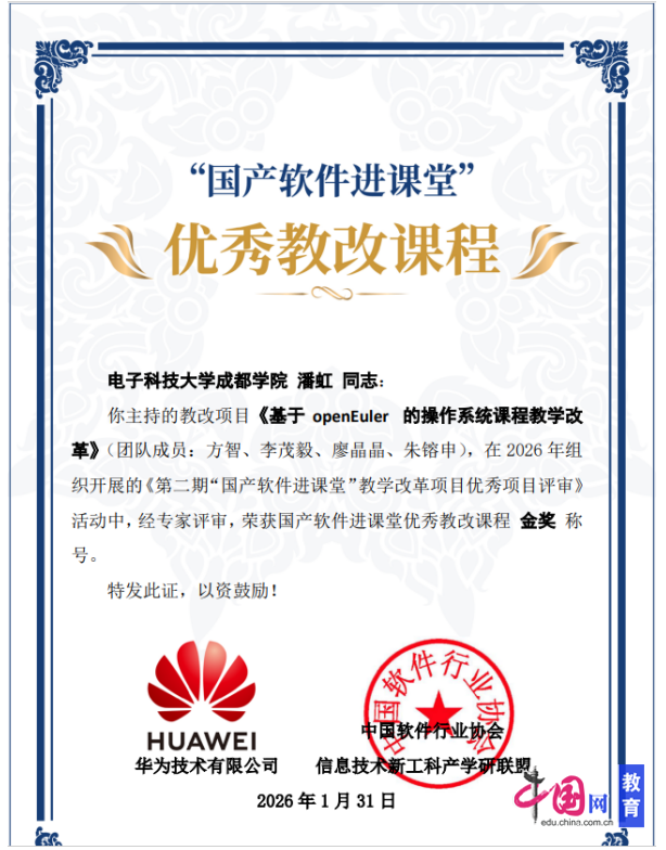 电子科技大学成都学院计算机学院潘虹、李茂毅、朱镕申、廖晶晶、方智五位教师组成的教学团队,围绕“以生为本、产教融合、知行合一”的教学理念,将openEuler开源操作系统作为教学载体,对操作系统课程体系进行了系统梳理与重构。课程改革实施后,学生的专业素养与实践能力得到显著提升,越来越多的学生开始关注国产软件发展,积极投身openEuler相关技术的学习与探究,在学科竞赛和开源项目实践中取得良好成绩。最终,《基于openEuler的操作系统课程教学改革》项目被评为“优秀教改课程”金奖。