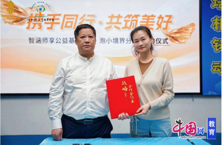 智涵师享爱心基金管委会常务副主任蔡忠军表示,智涵师享爱心基金始终聚焦教育公益领域,希望通过本次合作,为学校提供专业的心理支持资源,助力教师队伍健康发展,共同为孩子们营造更优质的成长环境。泡桐树小学境界分校党支部书记、校长刘芳菲对基金的支持表达感谢,称本次合作将有效提升学校教师心理服务保障水平,推动校园教育质量进一步提升。随后双方签署了长期合作协议并授牌。
