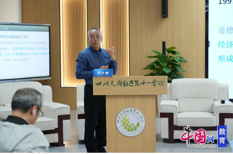 教师是立教之本、兴教之源。四川省教育厅教师校长培训专家工作组成员、教育部“国培计划”培训专家刘大春带来了《师德修养与教育家精神践行》的专题分享。他深入解读了新时代师德规范的具体要求与教育家精神的六大内涵,并以“爱、人、学”三字为纲,进一步明晰了师德底线。刘大春引导与会教师要以仁爱之心对待每一位学生,以躬耕不辍的态度对待教育事业,切实践行“躬耕教坛、强国有我”的崇高使命与责任担当。