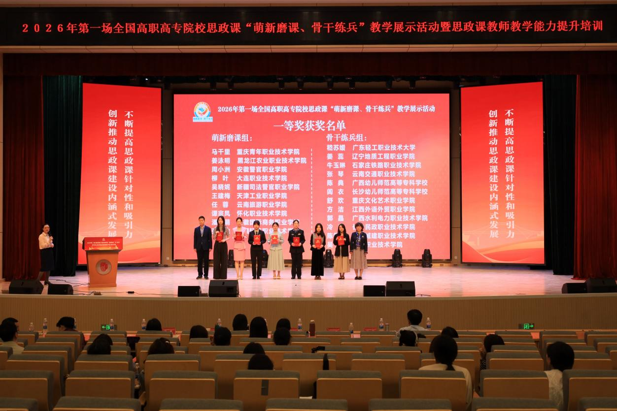 4月11日,2026年第一场全国高职高专院校思想政治理论课“萌新磨课、骨干练兵”教学展示活动在重庆圆满落幕。安徽警官职业学院马克思主义学院周小洲老师凭借出色表现荣获《思想道德与法治》“萌新磨课”组全国一等奖,实现学院全国思政课教学竞赛新突破。