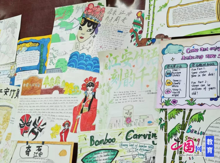 本次活动由学校英语课题组精心策划,鼓励同学们利用清明及春假假期,走进家乡实地探访江安奇石、国立剧专、夕佳山民居、江安竹簧四大文化名片,寻访名人古迹,品味特色美食,在实践中收集鲜活创作素材。同学们以画笔为媒、以英语为桥,将家乡风貌与英文词句巧妙融合,作品内容涵盖江安竹文化(竹雕工艺、竹元素插画)、传统戏曲(京剧脸谱、戏曲人物)、特色美食(红桥猪儿粑、江安年味小吃)、非遗文化与自然风光,色彩明快、创意满满,既传递了江安的本土风情,也体现了学生们对家乡文化的热爱与巧思。