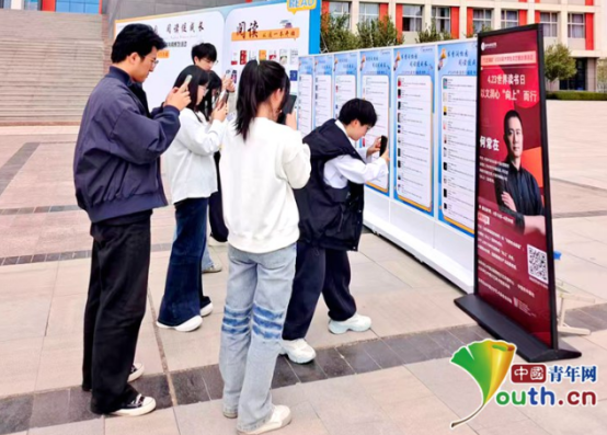 图为银川科技学院宣传“习艺强国”2026年大学生文艺思政课活动的场景,部分学生停下脚步,并用手机扫码观看课程。银川科技学院供图