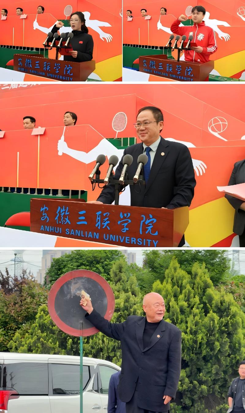 4月23日下午,安徽三联学院第二十三届运动会暨安徽三联集团第十四届职工运动会开幕式在主校区体育场举行。三联创始人金会庆,省教育督导专员、该校党委书记王光虎,安徽三联集团董事长余皖生,校长江秀丽等领导参加开幕式。开幕式由副校长宋梦岚主持。