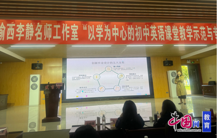 最后,宜宾市江安县大妙镇初级中学校省级课题负责人姚雪梅结合省级课题“‘双减’背景下农村初中英语作业创新设计与管理策略研究”成果,作《核心素养视域下的“学为中心·三段六环”初中英语作业创新设计实践与思考》专题讲座,系统讲解作业设计思路与实施策略。结合义务教育英语新课标,以“作业设计为核心素养的落地路径”为主题,通过“理论—案例—策略”的闭环、具体案例与可操作策略实现知行合一。她以学生视角重构作业,强调“作业是学习的一部分而非负担”,激发教师设计内驱力,跨学科融合意识:在项目实践中融入科学、社会等学科元素,呼应新课标要求。