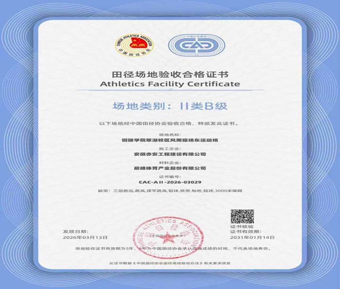近日,铜陵学院翠湖校区风雨操场东运动场正式通过中国田径协会(CAC)验收,获颁合格证书,达到国家级专业水准,被认证为Ⅱ类B级场地。