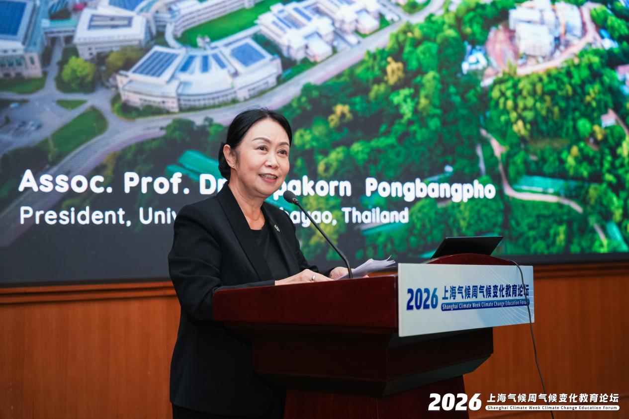 泰国帕尧大学校长苏帕功·蓬班福以“绿色发展视角下的气候变化教育”为题发表致辞,介绍了该校办学历程与“智慧赋能社区”的核心理念。她表示,帕尧大学以碳中和为目标打造绿色校园,将绿色发展理念全面融入全校18个学院的通识与专业教育体系,以校园为“活态实验室”,落地了绿色能源开发、循环经济实践、低碳交通建设等一系列气候变化教育项目,且相关实践成效获国际认可。苏帕功·蓬班福强调,气候变化教育的核心是培育学生的绿色思维,唯有将现代科技与社区传统智慧相结合,才能走出可持续发展之路。