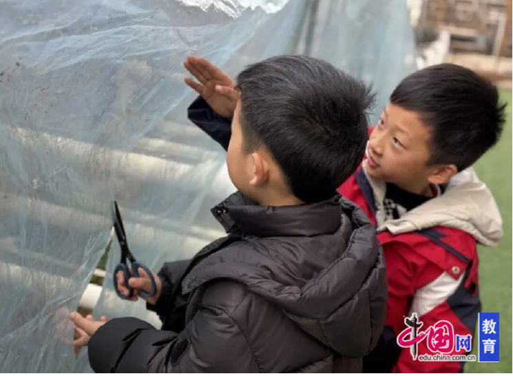 正当大家准备离开时,新的问题出现了——剪开的缝隙关不上,风会吹进暖棚。孩子们担心薄荷“着凉”,纷纷伸手堵住风口。宇宇和小罗找来细竹竿,将其横放在薄膜门下沿压实,暂时解决了漏风问题。可没过多久,门又开了,孩子们化身“小小工程师”,提出用绳子拴住、用夹子固定的办法,随后回教室拿来麻绳和夹子完善解决方案,成功解决了关门难题。