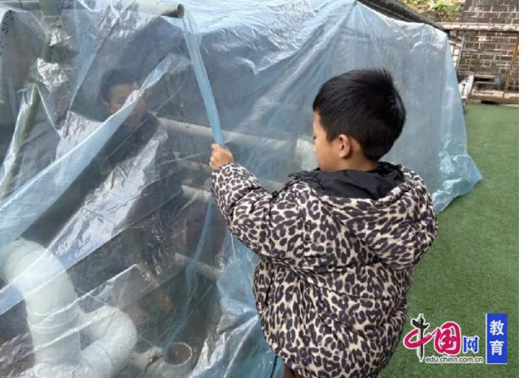 薄荷暖棚加固完成后,孩子们迫不及待前去观察。有的尝试钻进暖棚时,薄膜突然滑落罩住头部,抱怨进出不便;有的也担忧薄膜会被反复掀动损坏。就在大家发愁之际,杨杨提出给暖棚开个“小门”,这一想法得到孩子们的一致赞同。鑫煜借来剪刀,大家围在一起讨论门的位置和大小,最终决定先在薄膜中间剪出一条缝隙,一个简易“小门”很快成形,孩子们依次钻进钻出,感受着亲手创造的快乐。
