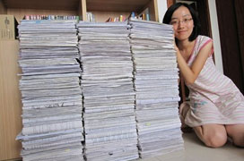 高三女生晒三年试卷 摞起来有2.41米高(图)